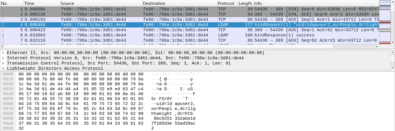 We have next to no rights on this box other than to our own home directory. I tried some of the usual stops here, such as Linenum and pspy, but to no avail. I ended up connecting to LDAP with no credentials, which let me see a few things, including password hashes for ldapuser1 and ldapuser2. I tried cracking these with both john and and hashcat using rockyou.txt without success. I had to call in some major support from my teammates, and once again I learned another step I should be using in my investigation: packet captures.