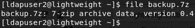 If we take a look in the /home/ldapuser2 directory, we'll see a file named backup.7z. Once we've found this file, we can run file against it to confirm that it is, in fact, a .7z file.