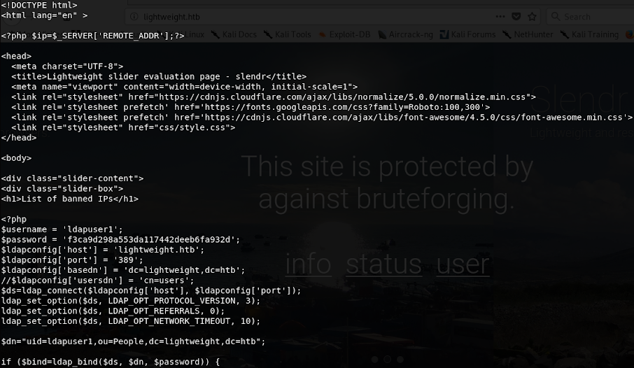 Now we can extract the archive, and inside we find multitude of files. However, the file I am interested in is status.php. Why? Think about your experience when browsing the site on port 80. Was there any page that took longer to load than the others? For me, it was the blacklist page, status.php. Reviewing the source for this .php file, we locate the credentials for ldapuser1: