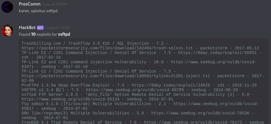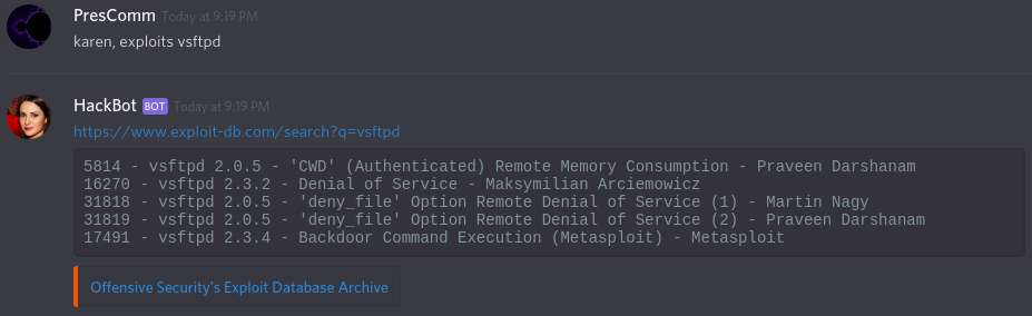 Since we can't really proceed any further with web services, let's revisit FTP. You may have noticed in the earlier screenshot that a particular FTP server application and version number were discovered by Nmap. If you're on Kali, we can run those through searchsploit. If you're a 0x00sec VIP member, you can have Karen take a look for you via Discord:
