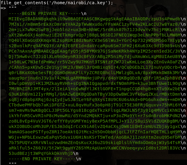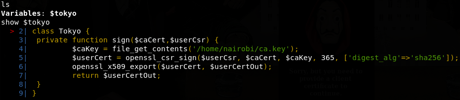 We have some code in here that looks interesting enough. There is one bit in particular that stands out because, if you recall, the HTTPS web page stated that we need a client certificate to proceed. Incidentally, this code appears to mention a CA key, which might be exactly what we need to craft our own client certificate. I decided to rip the command straight out of $tokyo without assigning a variable. I ran it, and got some results: