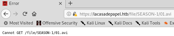 Okay, so the actual URL, when decoded, is hxxps://lacasadepapel.htb/file/SEASON-1/01.avi. Let's try that in our browser now to see what happens: