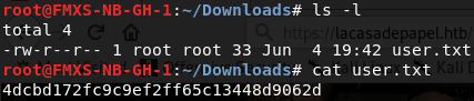 We can't read directories with this trick. That's fine. Let's go for some loot and see if we can grab the user flag. Our path is ../berlin/user.txt, and in base64 that is Li4vLi4vYmVybGluL3VzZXIudHh0. Once again, our full path is hxxps://lacasadepapel.htb/file/Li4vLi4vYmVybGluL3VzZXIudHh0