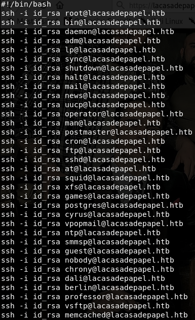 We can't dive very deep into any of these folders, so we'll have to do some research on each of these folders. We could also grab the server.js file with our base64 directory traversal trick, but we're trying to get a better shell, hopefully as a better or at least different user. To that end, .ssh intrigues me. I had some cursory knowledge prior to doing this box, but some quick Google work led me to the knowledge that the file id_rsa lies within this folder. With this file, we can authenticate to the victim box over ssh and get a better connection (hopefully!). Using our trick, we come up with the path hxxps://lacasadepapel.htb/file/Li4vLi4vYmVybGluLy5zc2gvaWRfcnNh