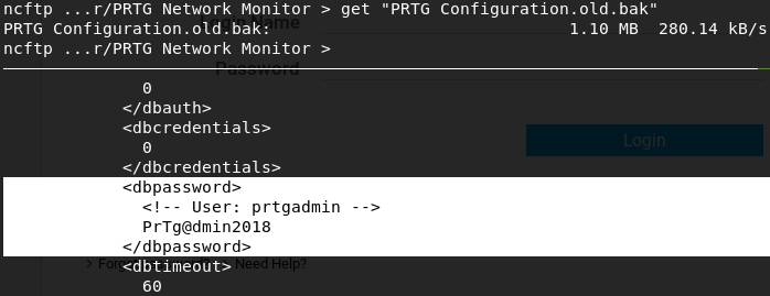 While we're still connected to FTP, we need to look around. I am much more familiar with Windows machines than I am with Linux, so it doesn't take me long to find the ProgramData folder, which is normally hidden, but we can forcefully browse to it even if it isn't listed. I immediately see the Paessler folder and continue to drill down and explore the file structure. I also spend some time Googling vulnerabilities for PRTG while exploring, and I stumble upon a post indicating that PRTG versions earlier than 17.4.35.3326 stored plaintext credentials in configuration files. On Netmon, there are a few different configuration files, but if we take our time and be thorough, we'll read through each one and eventually discover that PRTG Configuration.old.bak contains the password: