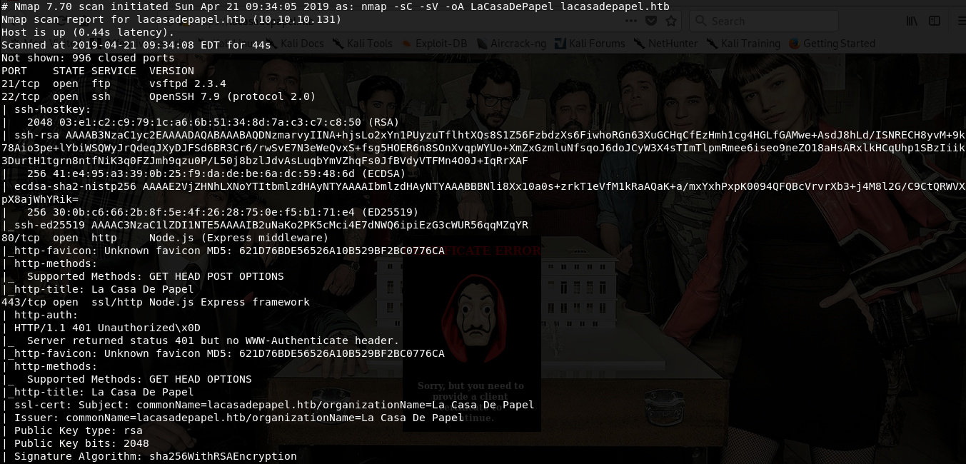 nmap -sC -sV -oA LaCasaDePapel 10.10.10.131