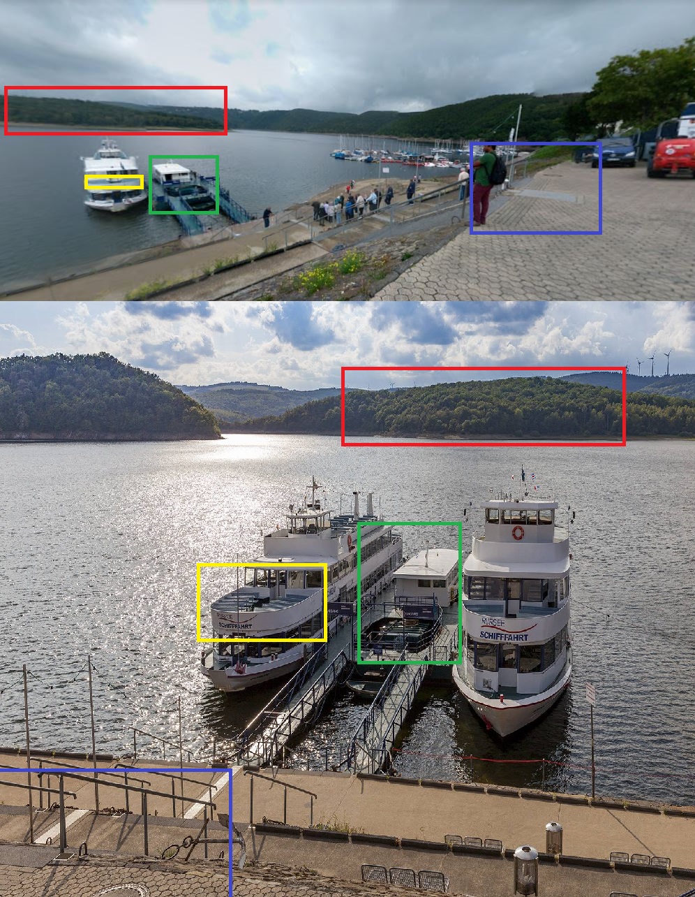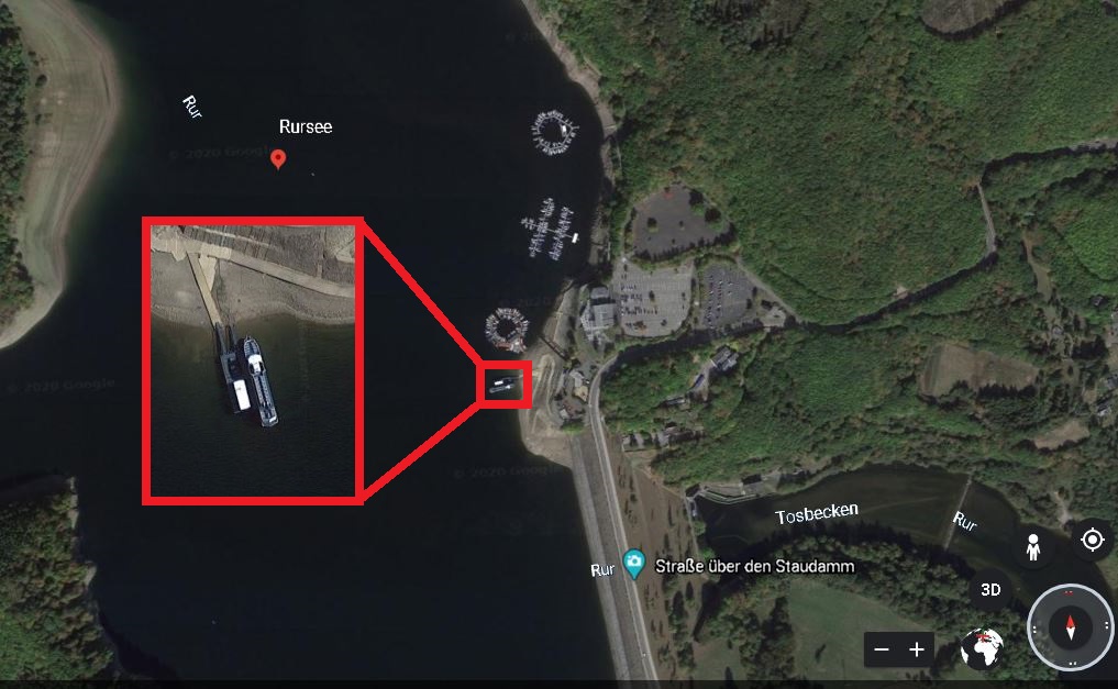 So, we have somewhat arrived at the answer to our first question. There may have been an alternative way to find these ferries without the one lucky crop that leads to the image containing the tower. However, it may or may not presuppose that we knew that Woffelsbach was close to Rurtalsperre Schwammenauel, and this crop itself was also somewhat lucky. It was definitely far easier to get incorrect crops than it was to get correct crops.