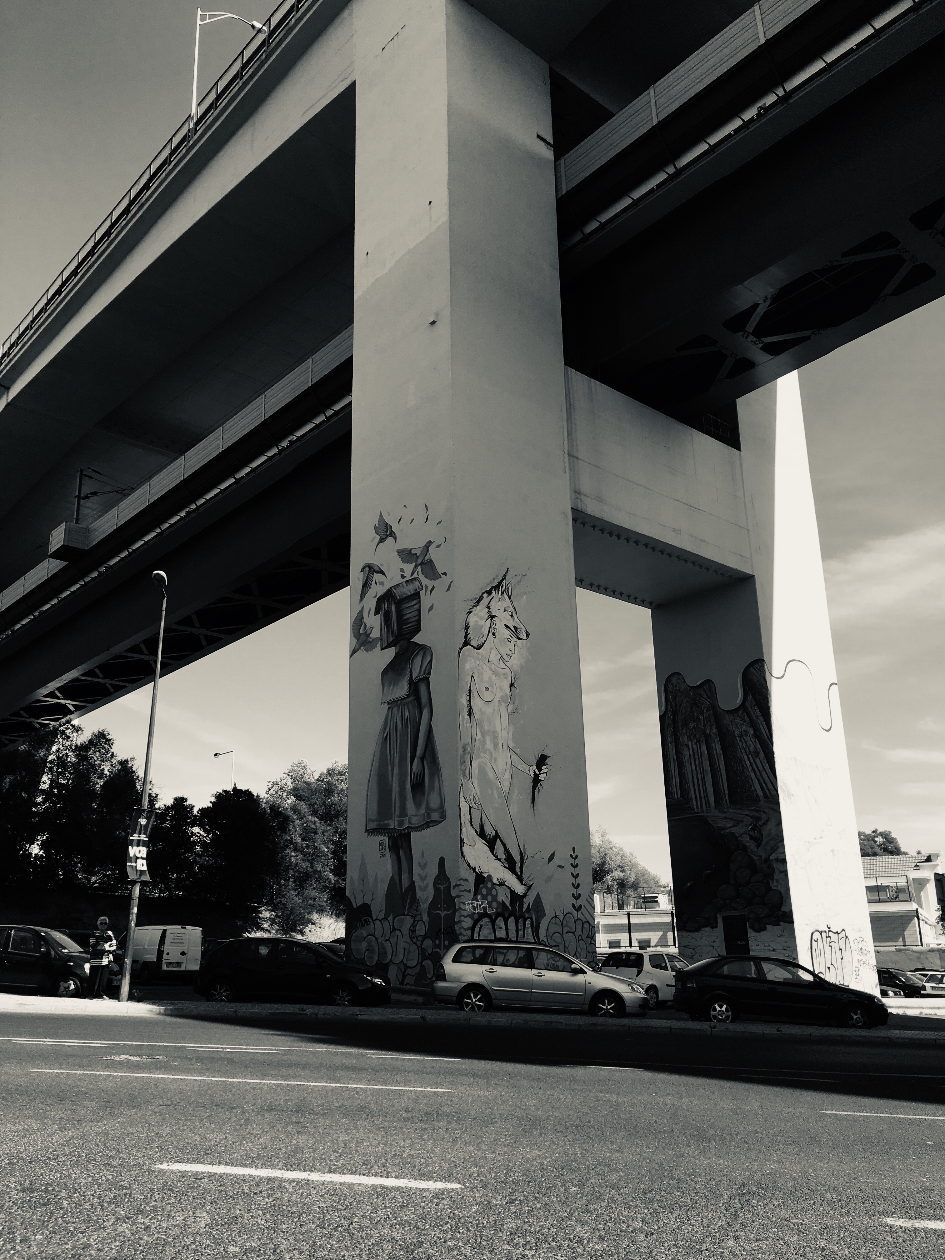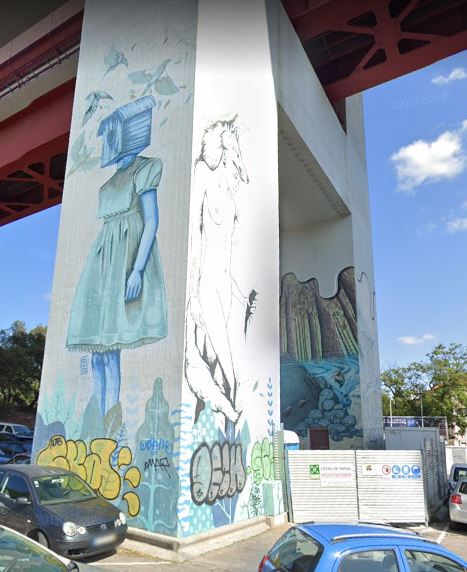 Figuring that the bridge's pillars might be the home of our beautiful street art, I basically "drove" down the road, keeping the bridge as my destination. In less than a minute, I spotted our art-wrapped pillar: