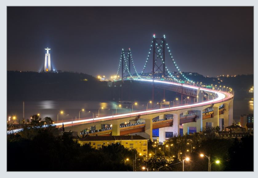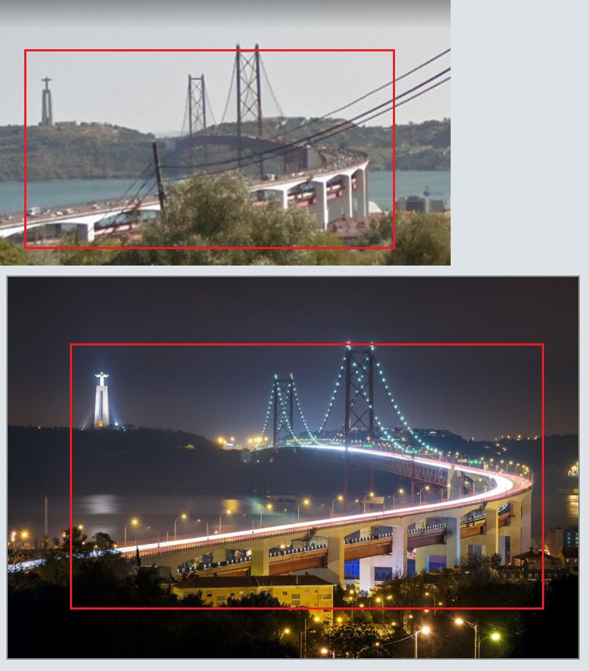 The two big things I noticed are the space between the pillars and the number of lane markers on the road. That tells us how far back we are from the pillars and how far to the left or right we likely are. We're far enough away in the original photo to see all of the lane markers. We're also far enough to the right to make the gap between the pillars visible, but not so far right that the island in the middle of the road is in the shot.
